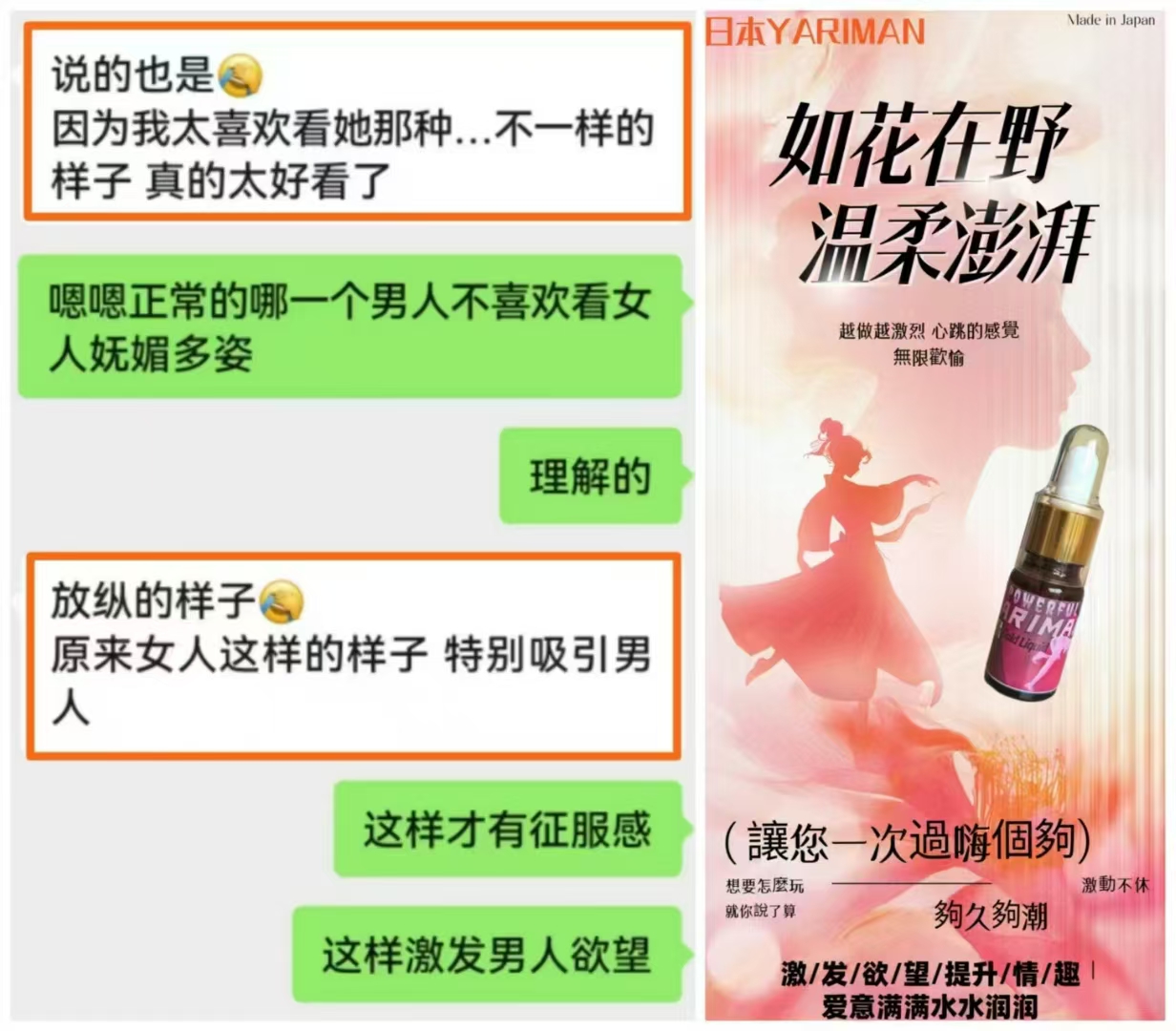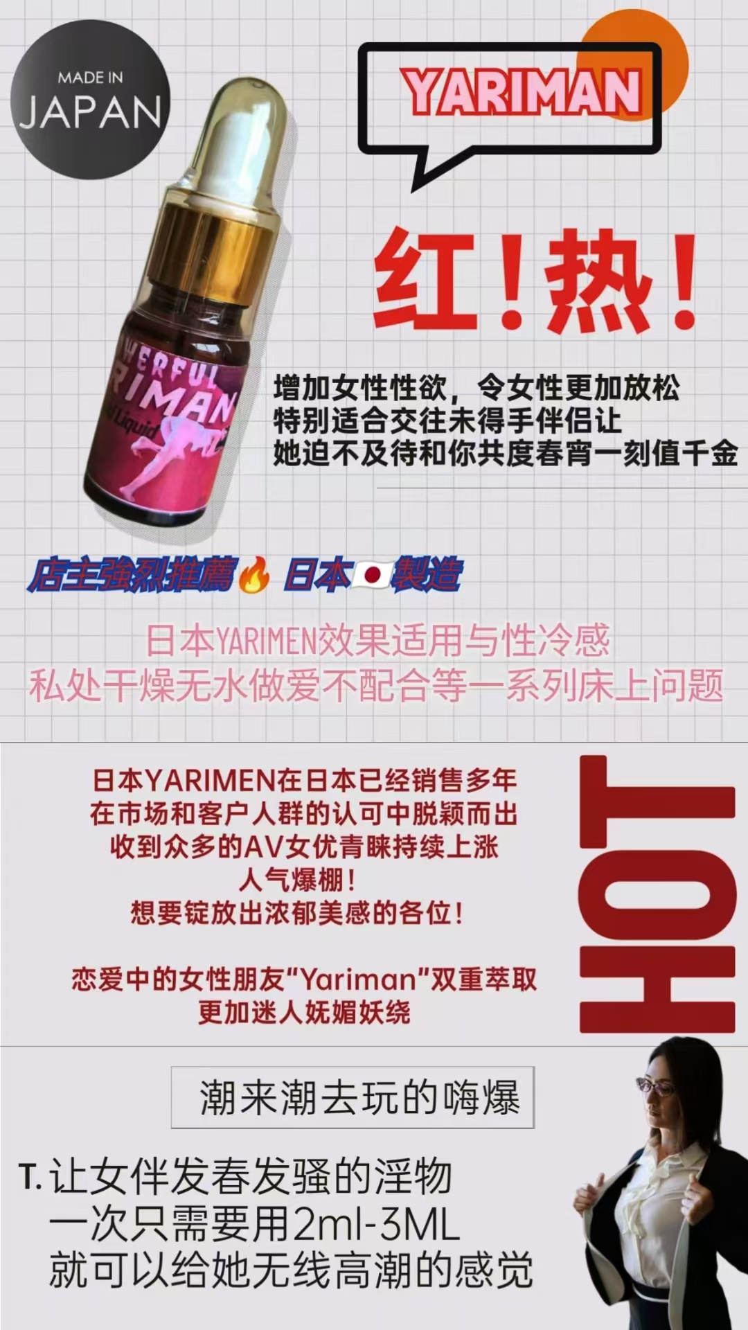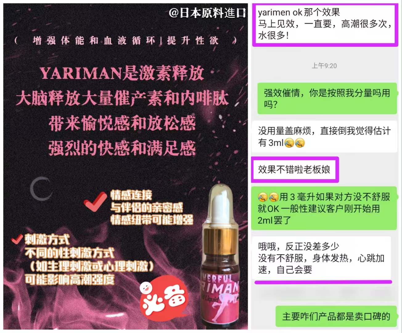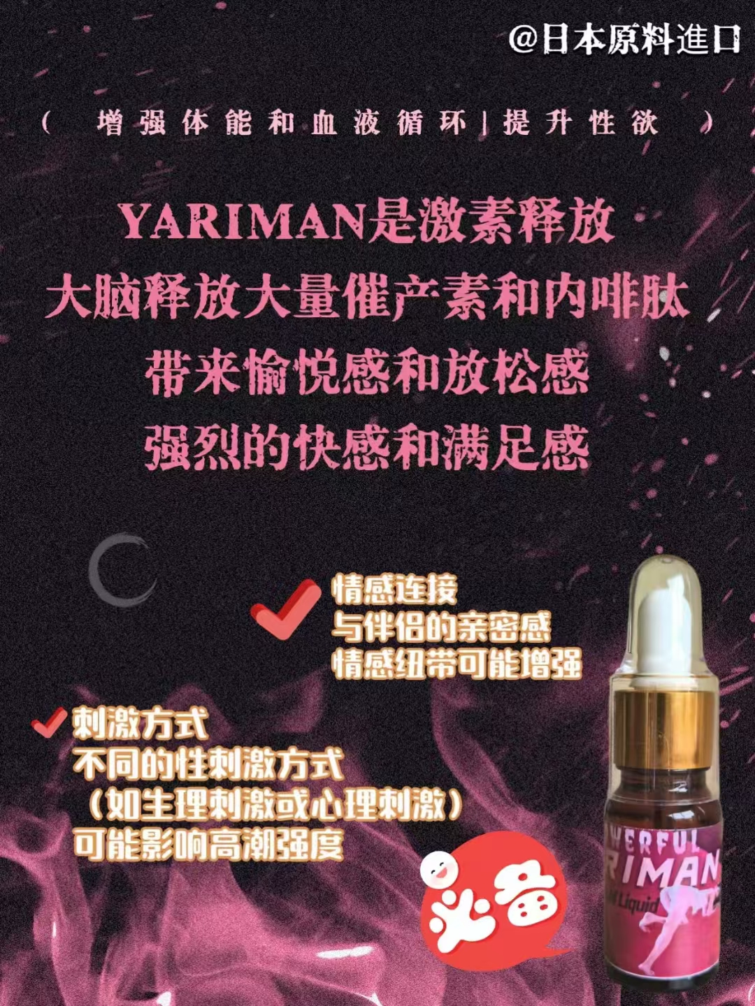服用後全身發熱,性慾亢奮,心情愉悅,思維活躍,個人防線放開,是理想的催情助性產品,因為產品成分完全不屬於毒品,所以更不用擔心警察的檢查,是去娛樂場所的必備產品。